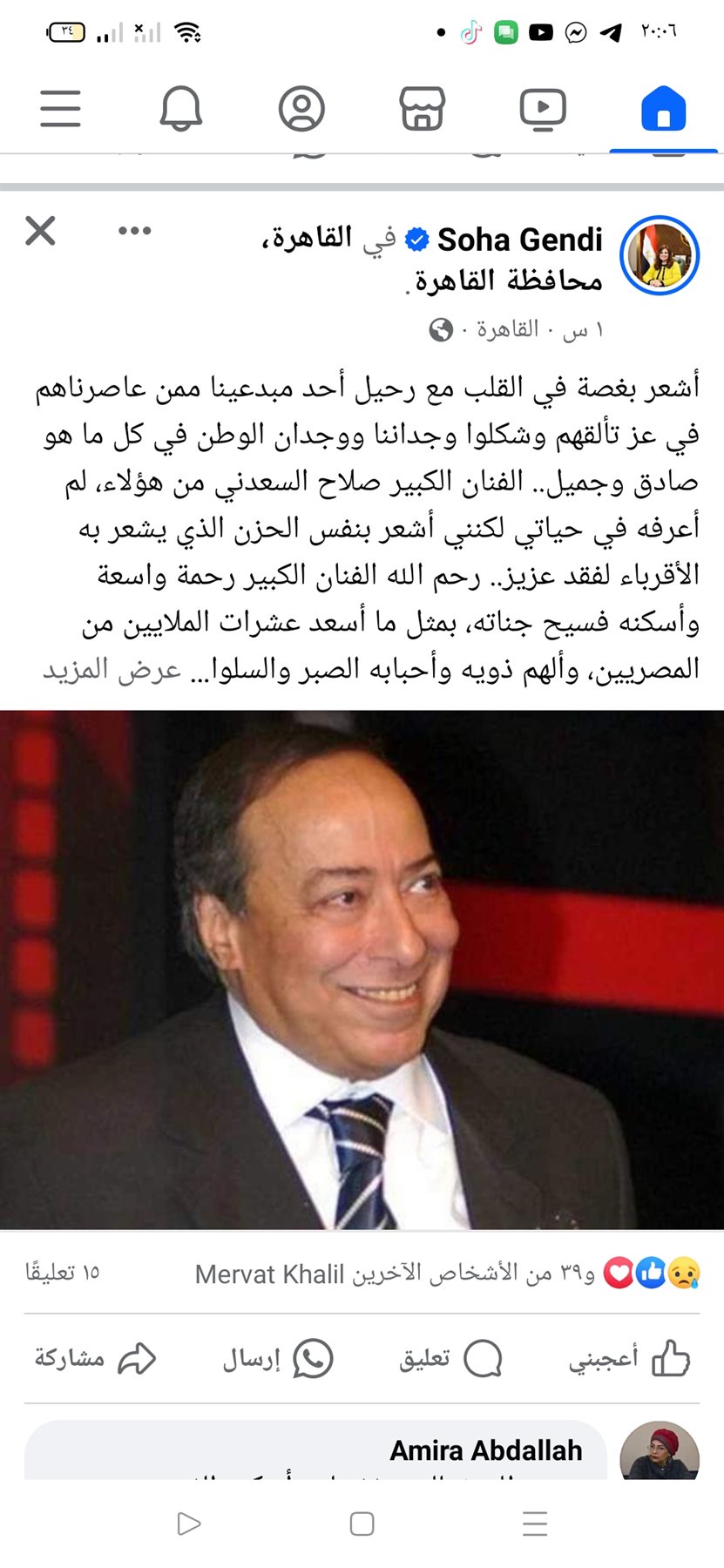 وكتبت وزيرة الهجرة، على صفحتها الرسمية على الفيسبوك، “ أشعر بغصة في القلب مع رحيل أحد مبدعينا ممن عاصرناهم في عز تألقهم وشكلوا وجداننا ووجدان الوطن في كل ما هو صادق وجميل.. الفنان الكبير صلاح السعدني من هؤلاء،.”.