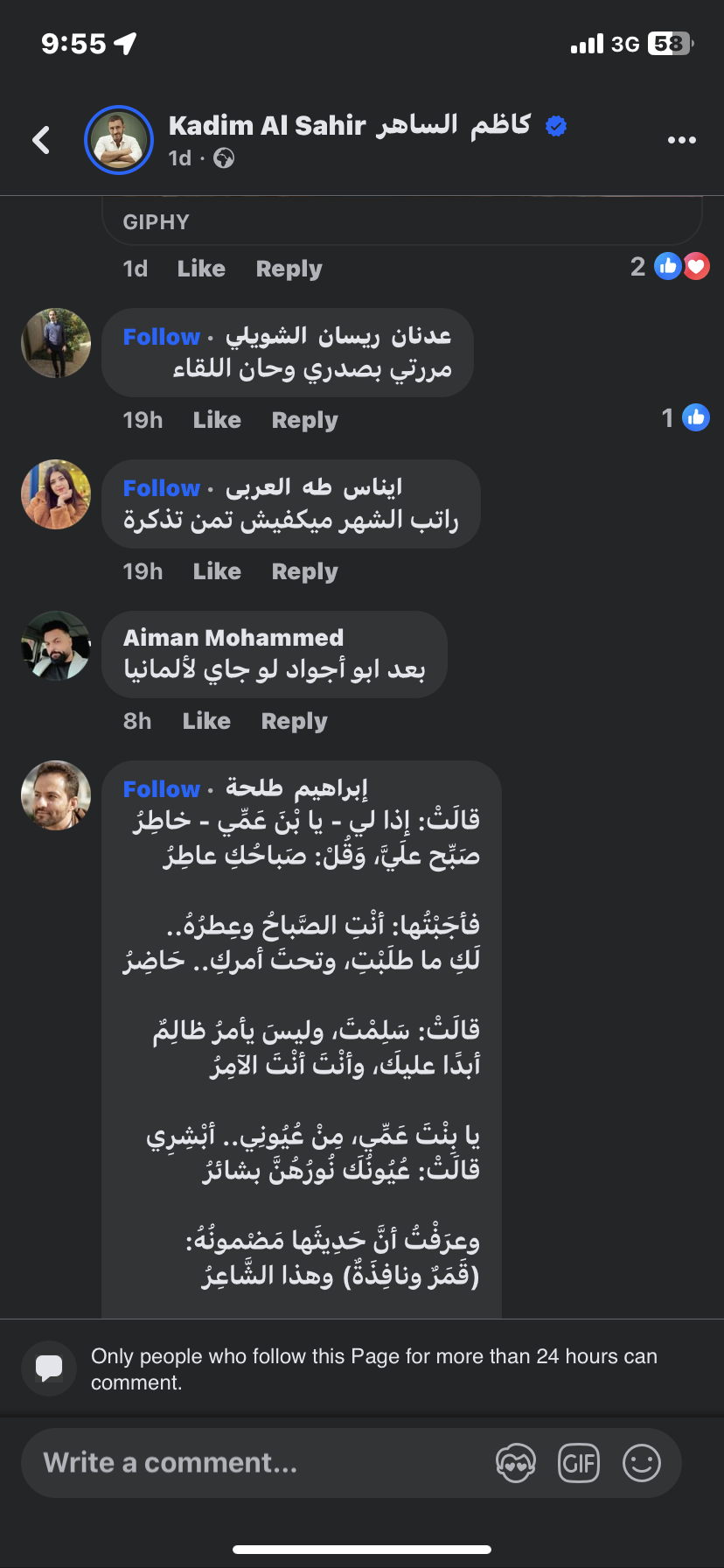 كما علق آخرون: “عندك حق جمهور كاظم الحقيقى معظمه للأسف مش هيقدر يحضرها الحفلة لان أسعارها مبالغ فيها جدا …كاظم احنا بنحبك قوى قوى وما تحرمنا من حضور حفلات بمصر بعد غياب سنتين…ومن قبل حفل الأوبرا كان قبلها غياب ١٣ سنة انت وحشتنا جدا جدا وجمهوره بمصر بالملايين وعايزين حفلات كتير بمصر زى زمان فاكر لما كنت عايش معانا هنا كانت أجمل حفلات وبرامج بحياتك كلها مصر”.