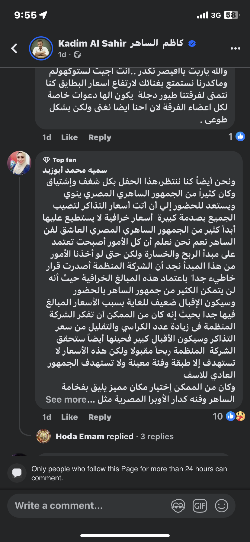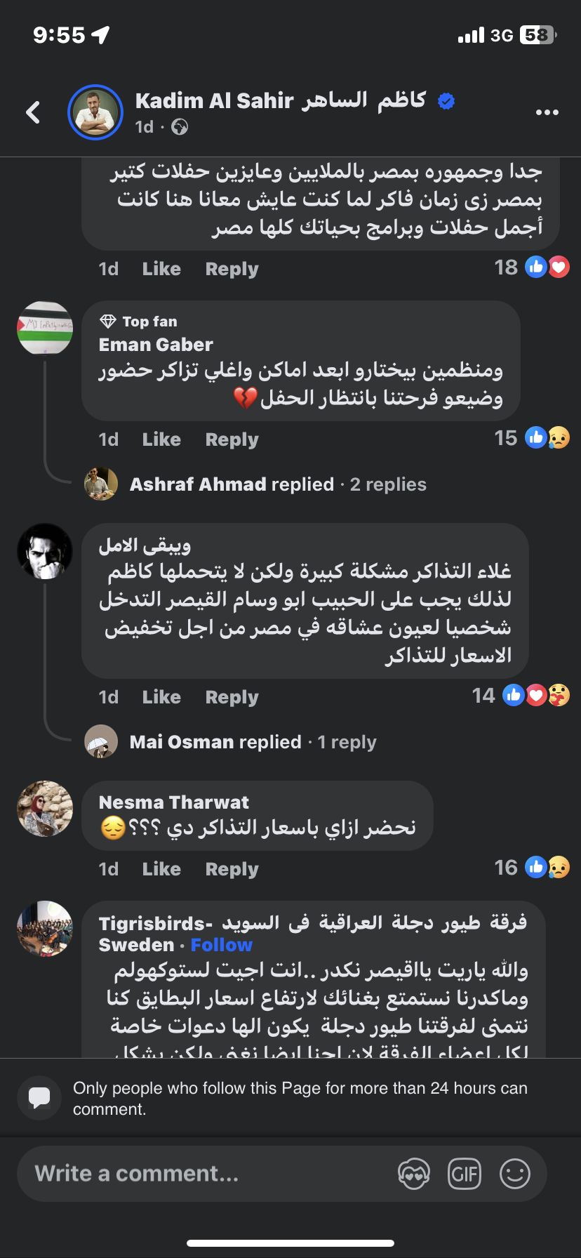 وأضاف بعضهم: “غلاء التذاكر مشكلة كبيرة ولكن لا يتحملها كاظم لذلك يجب على الحبيب ابو وسام القيصر التدخل شخصيا لعيون عشاقه في مصر من اجل تخفيض الاسعار للتذاكر … نحضر ازاي باسعار التذاكر دي ؟؟؟ …. التذاكر غاليه جدا ف القاهره … يعني اخر حفله في الأوبرا كانت 5000 وحتي الساحل كانت 8000 لو كده معقول إنما الاسعار محدش يتحملها”.