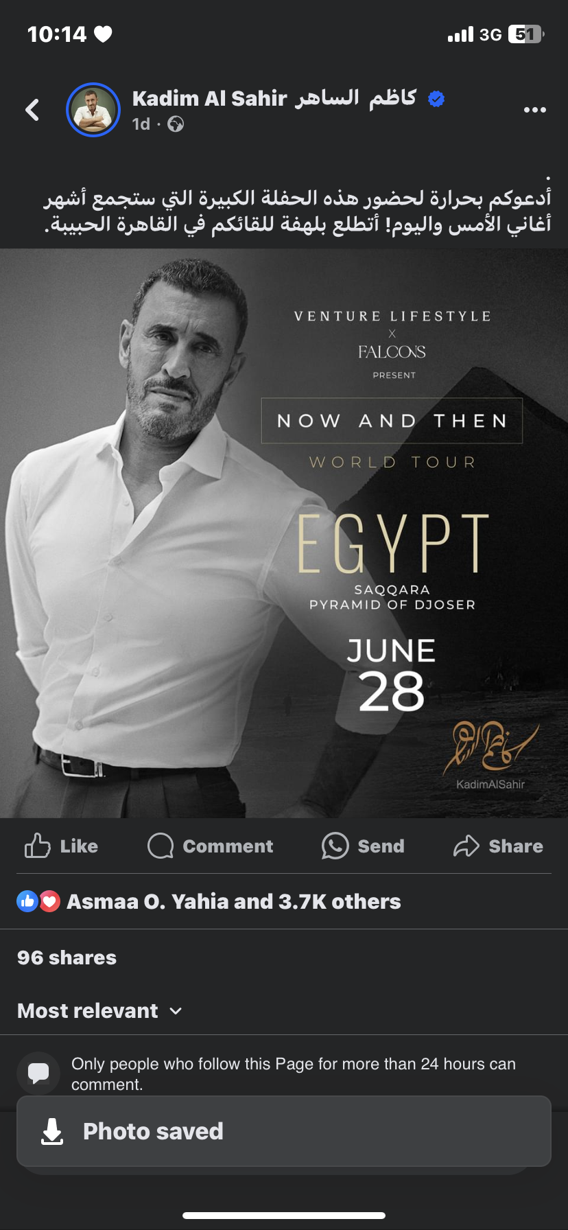 ومن المقرر أن يُقام حفل المطرب كاظم الساهر في منطقة هرم سقارة بالبدرشين وذلك يوم الجمعة الموافق ٢٨ يونيو المقبل.