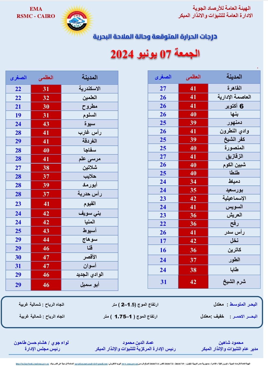 ونشرت الهيئة درجات الحرارة الصغرى والعظمى المتوقعة بالمحافظات اليوم والتي جاءت كالتالي: