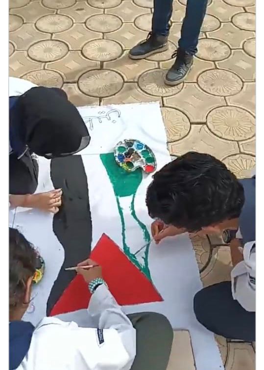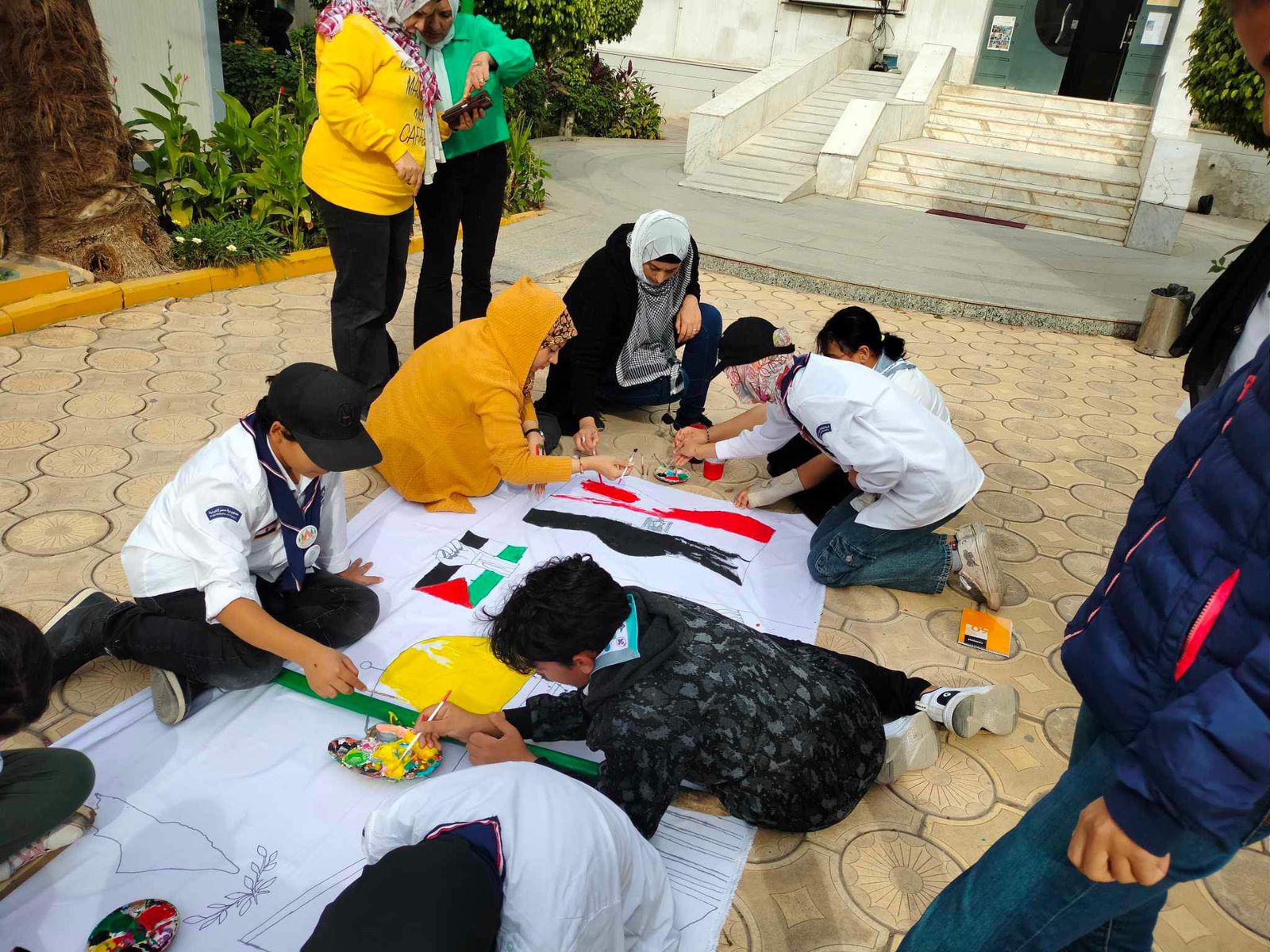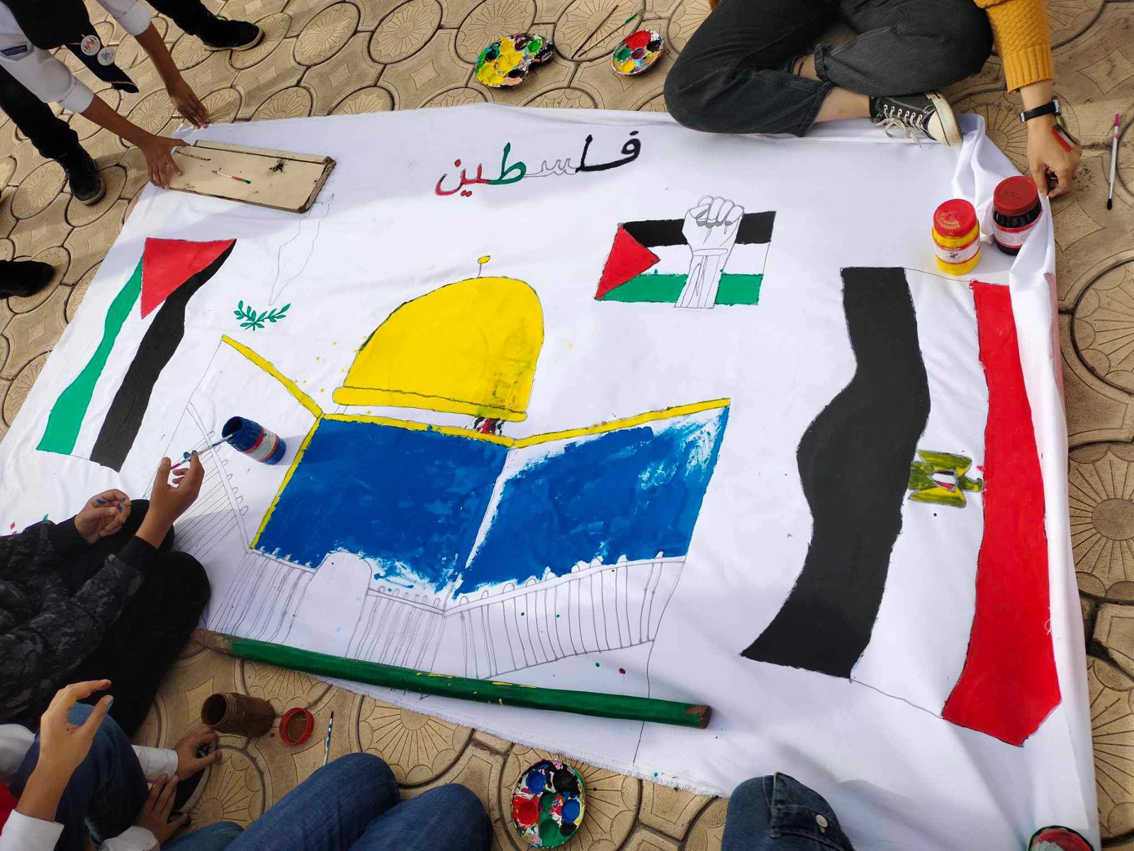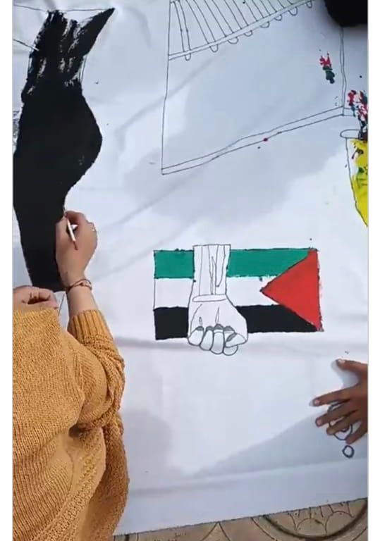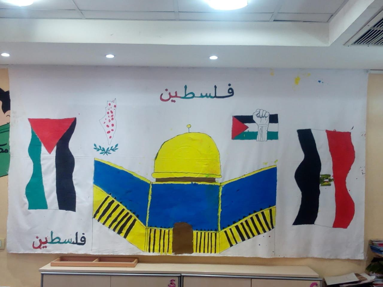 اوضح الدكتور نبيل حلمي، رئيس مجلس ادارة جمعية مصر الجديدة، ان احدى الرسومات لوحة تتضمن علم مصر بجوار علم فلسطين، وأسفلها عبارة مصر.. فلسطين إيد واحدة، وصورة أخرى علم فلسطين فوق الرؤس ورسم علم فلسطين، كما قام الاطفال برسم جدارية، تضم رسومات تعبر عن الوضع الراهن في فلسطين.