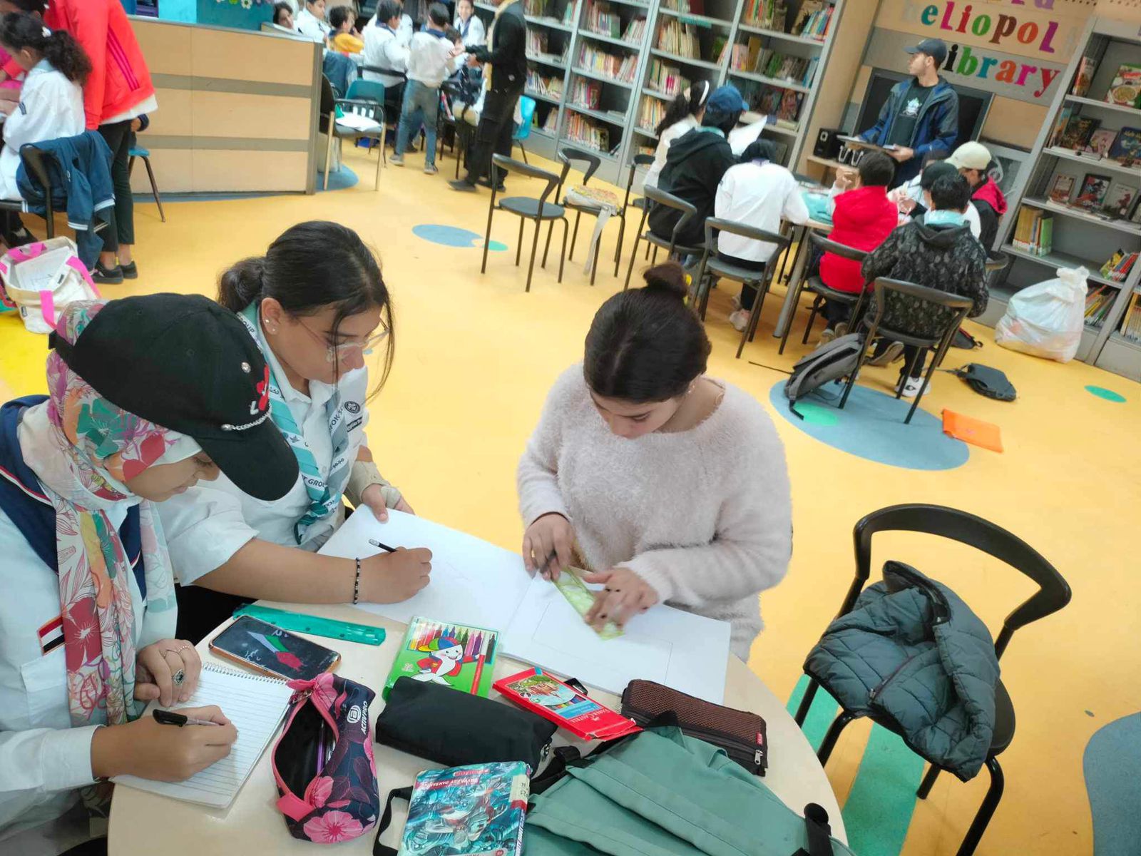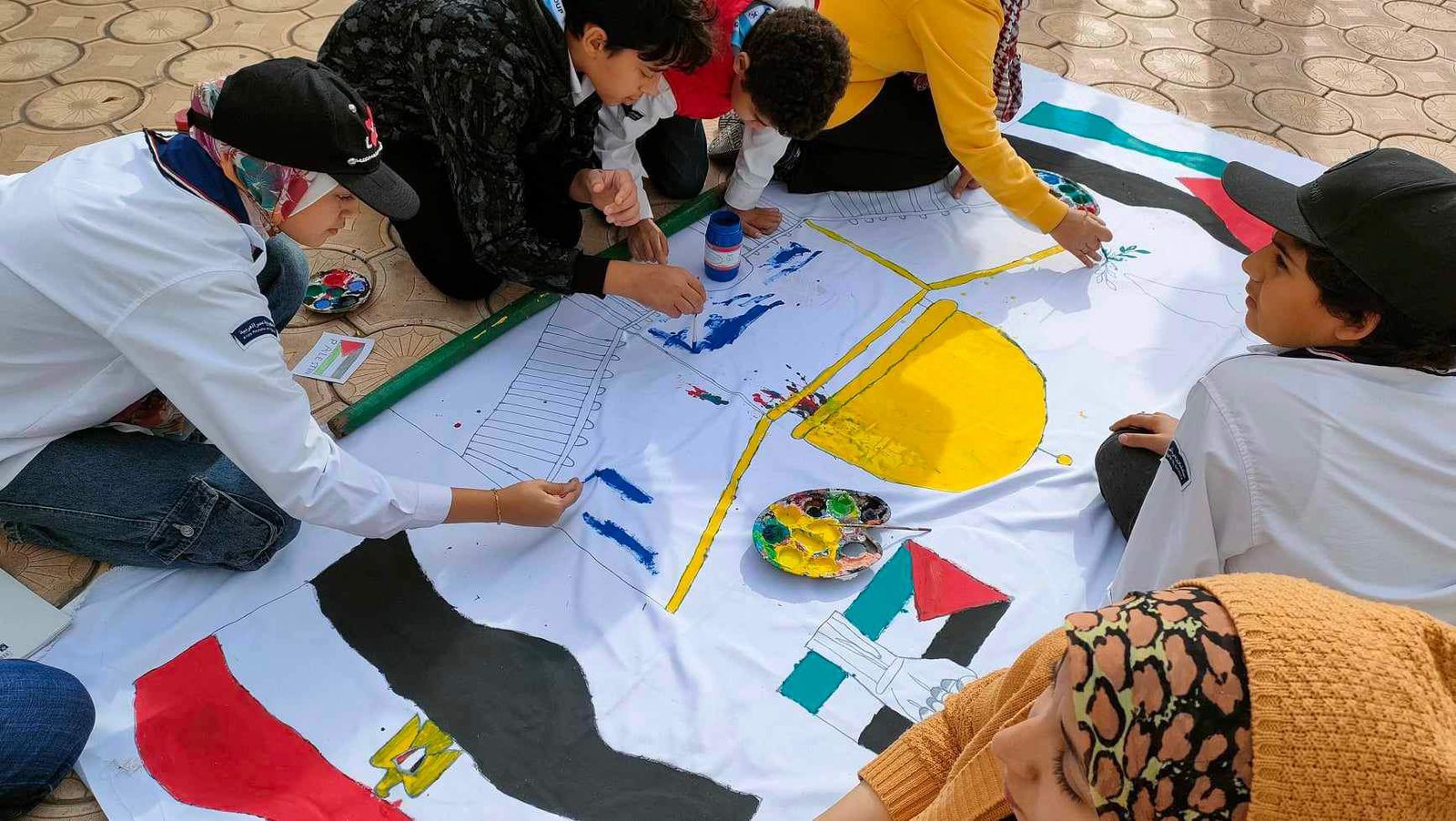 وجه أطفال مكتبة مصر الجديدة، رسالة تضامن للشعب الفلسطيني من خلال ورش عمل بالرسم، أقيمت أمس، السبت.