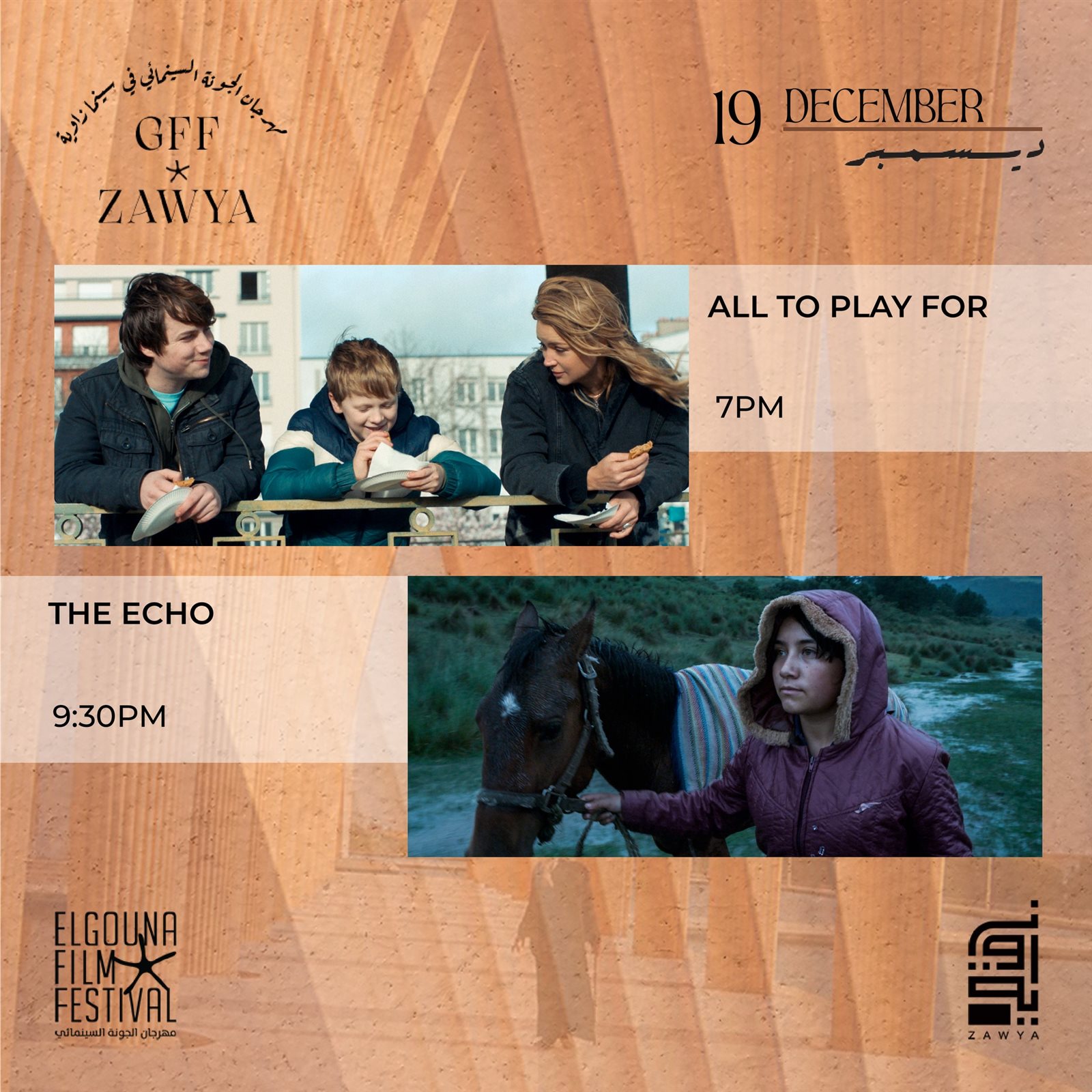 ومن المقرر أن تتضمن سلسلة العروض اليوم الثلاثاء 19 ديسمبر فيلمي all to play for في السابعة مساءً، وthe echo في التاسعة والنصف مساءً.