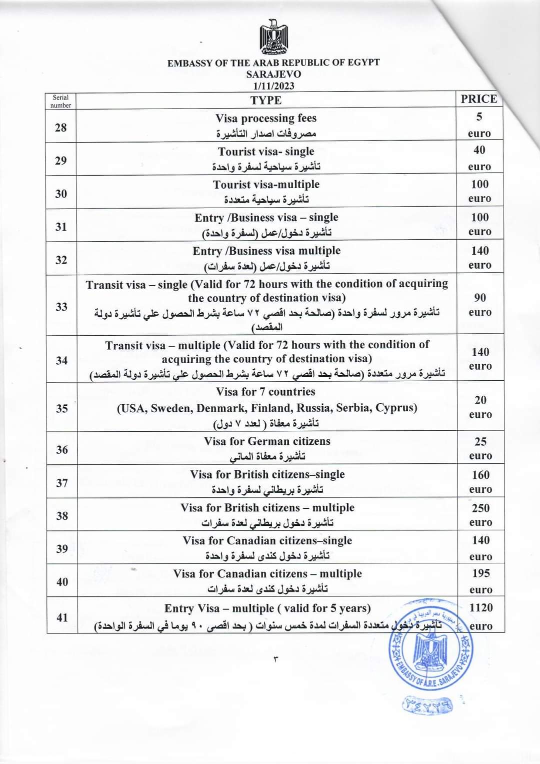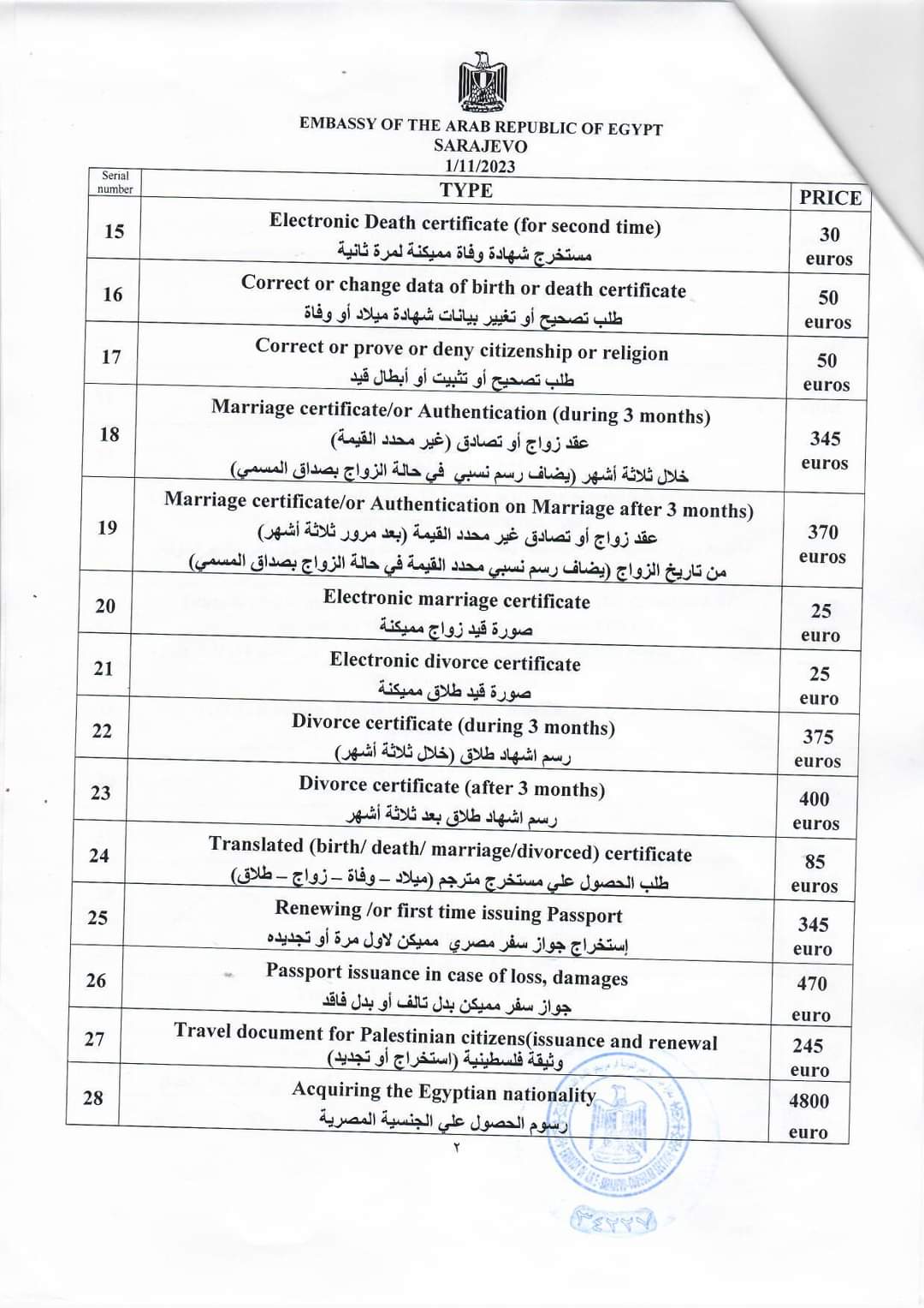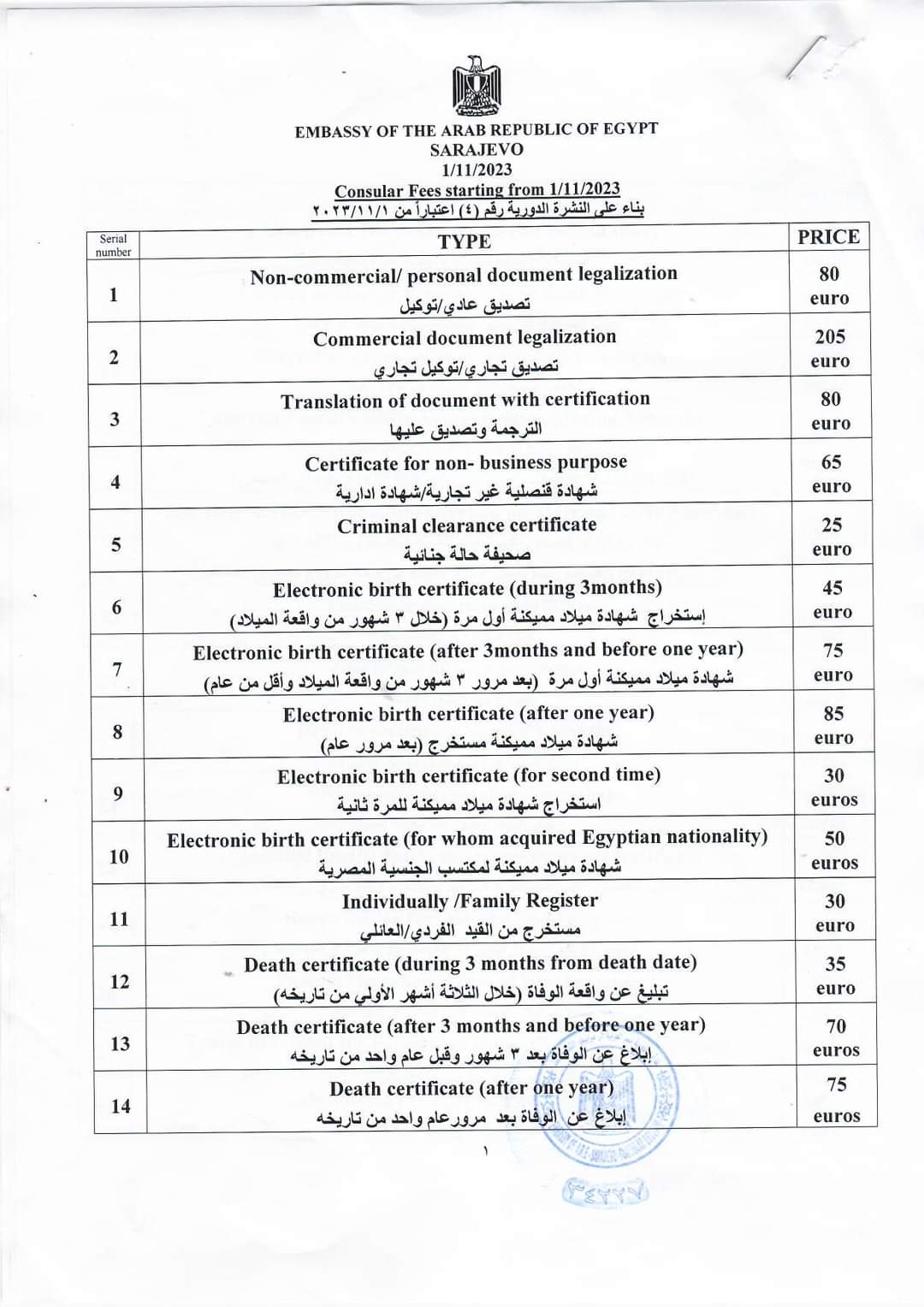 أعلنت سفارة جمهورية مصر العربية بسراييفو عن قائمة الاسعار الخاصة بكافة المعاملات القنصلية التى تقوم بها السفارة بداية من الأول من نوفمبر 2023، وذلك عبر منشور رسمي على صفحتها على الفيسبوك.