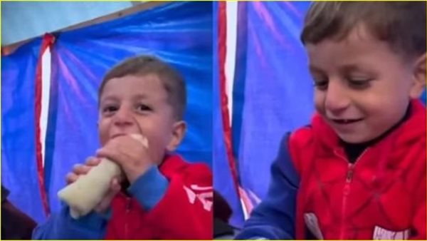 وفوجئ الطفل بأن الشطيرة هي شاورما دجاج، وبات يهلل ويضحك وكأنه عثر على كنز في الصحراء، ويهم ليقضم منها قضمة كبيرة، وهو يضحك وحوله أطفال يضحكون معه.