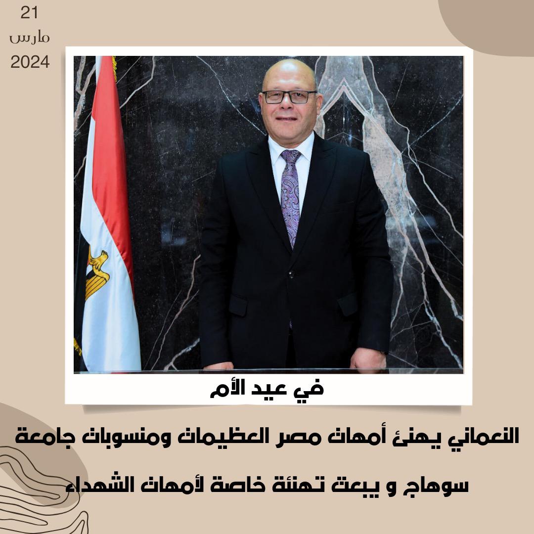 تقدم الدكتور حسان النعماني رئيس جامعة سوهاج، بأسمى آيات التهنئة لعظيمات مصر من الأمهات وكافة منسوبات الجامعة، بمناسبة عيد الأم، معربًا عن تقديره العميق للدور التاريخي والريادي الذي تضطلع به الأم المصرية في شتى المجالات الإنسانية، فهن شريكات رئيسيات في بناء الوطن وتحقيق تقدمه.